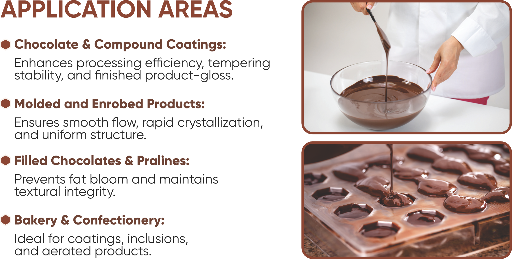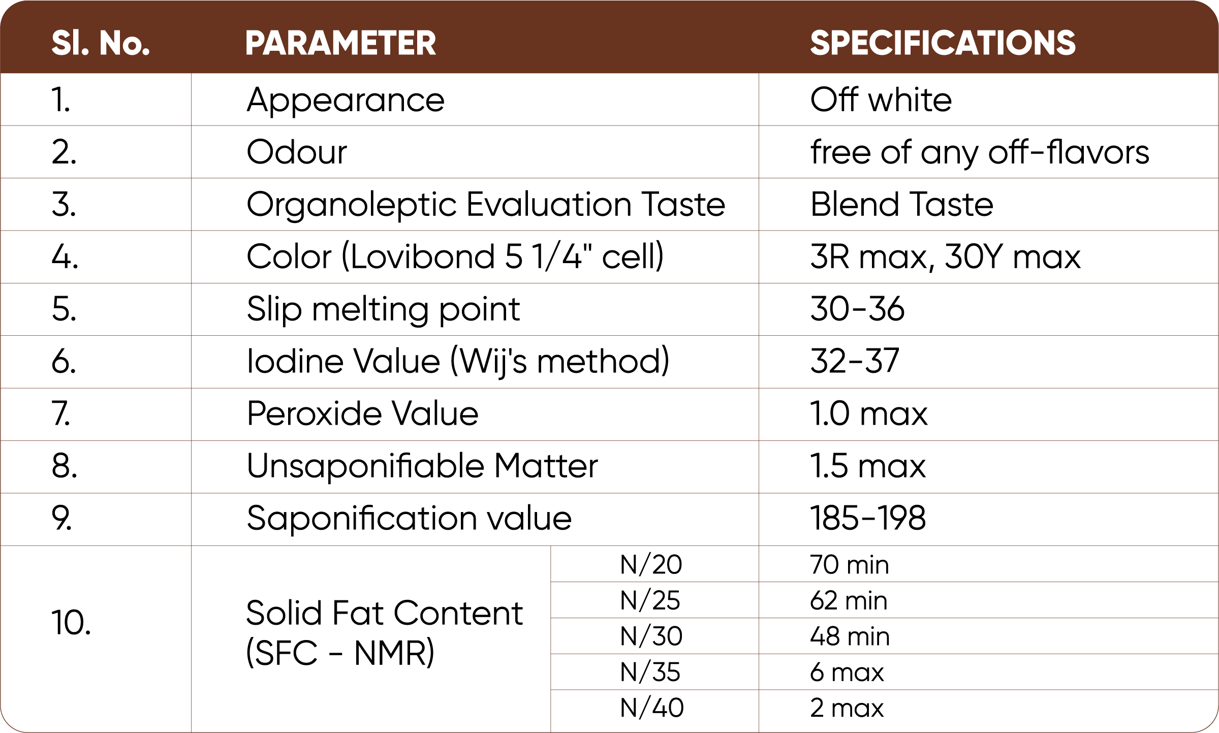 Mello-SL001 is a fully refined, non-hydrogenated vegetable specialty fat made from fractionated sal fatand palm oil, formulated as a CBE, Solid fat comprising of mixed fatty acids mainly Palmitic, Stearic and Oleic.