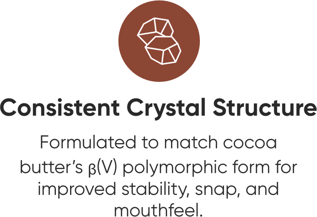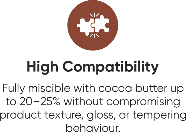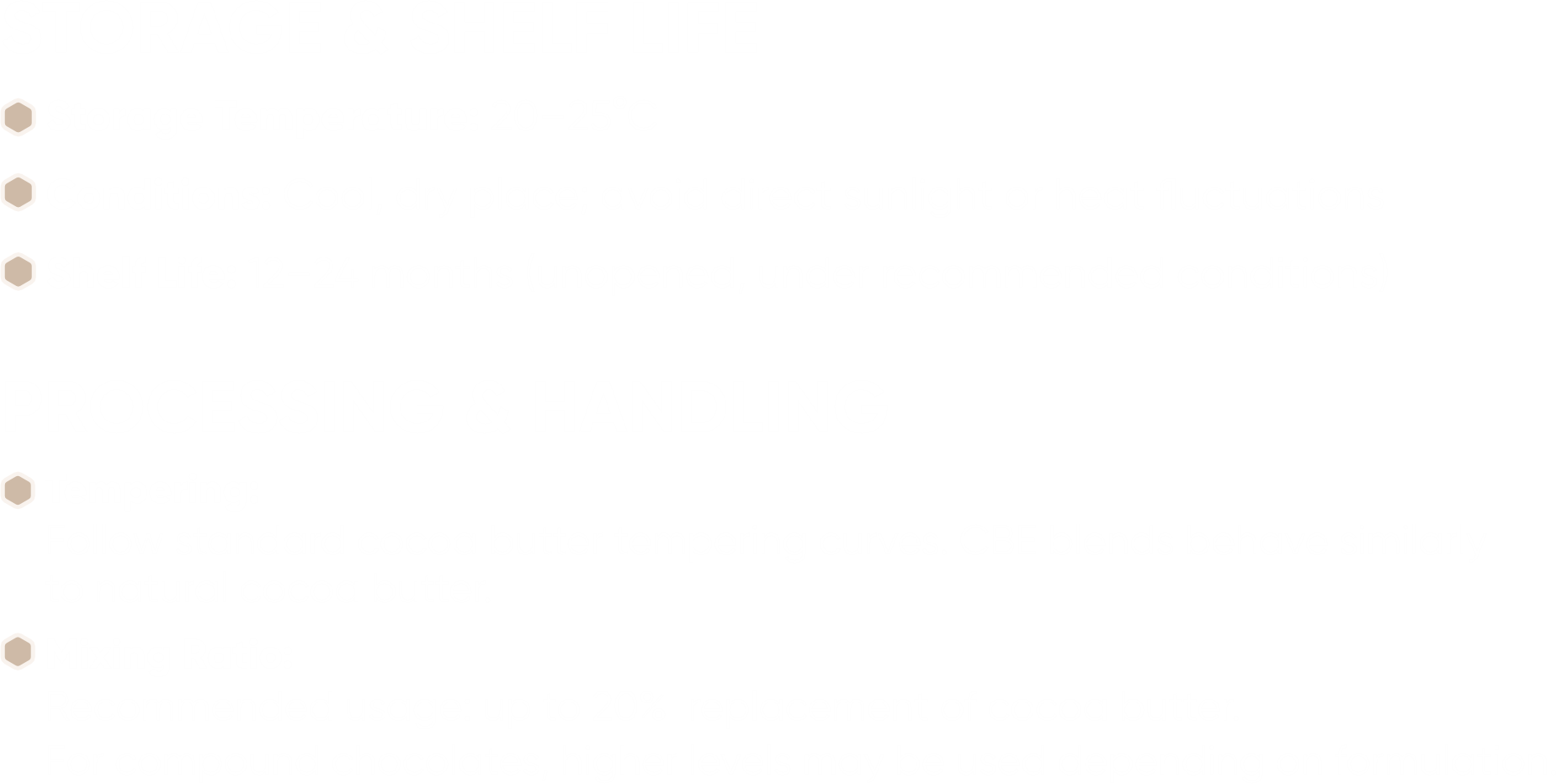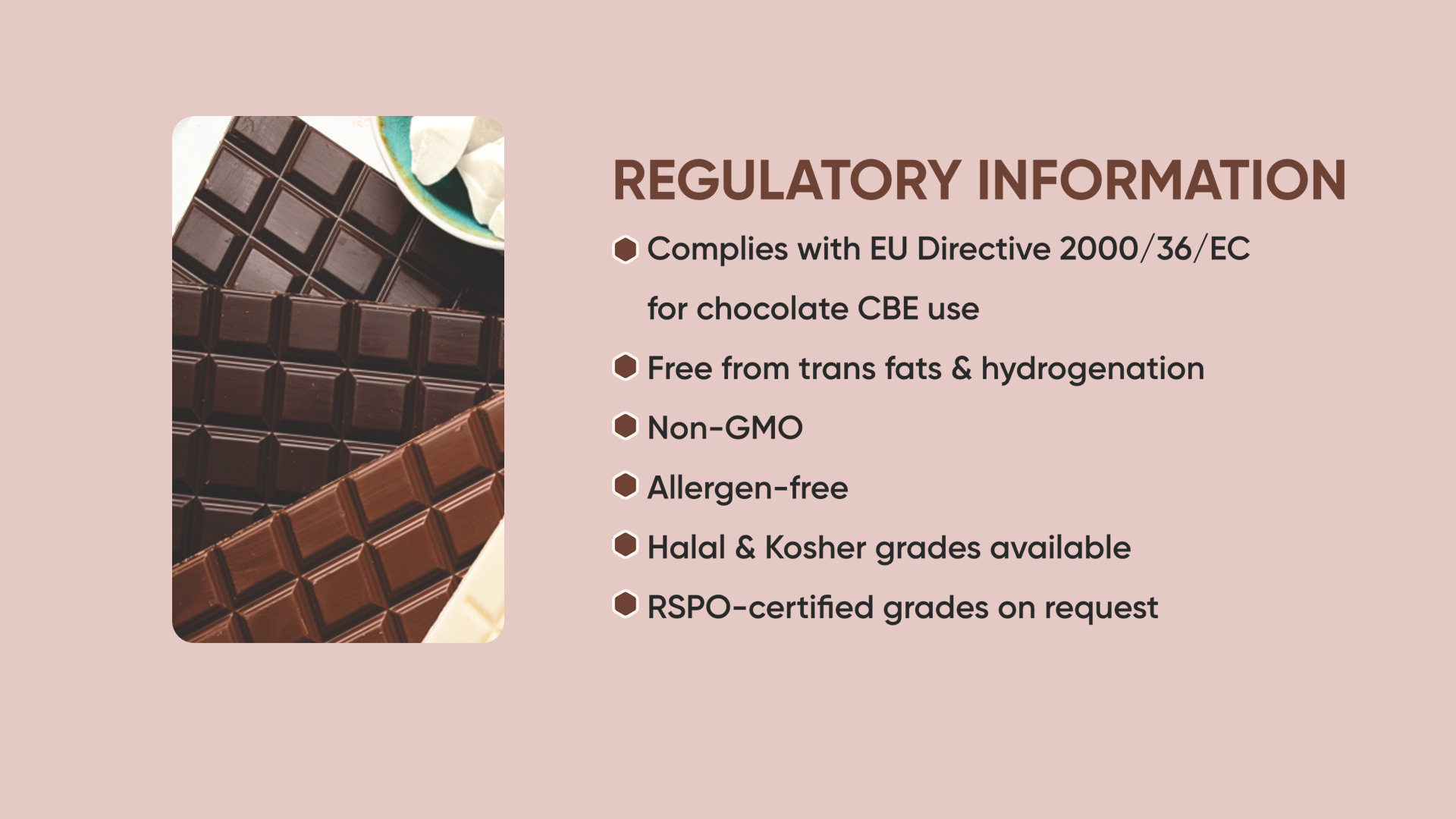 Mello – SH111 is a fully refined, non-hydrogenated vegetable specialty fat made from fractionated shea butter and palm oil, formulate as a CBE, Solid fat comprising of mixed fatty acids mainly Palmitic, Stearic and Oleic.