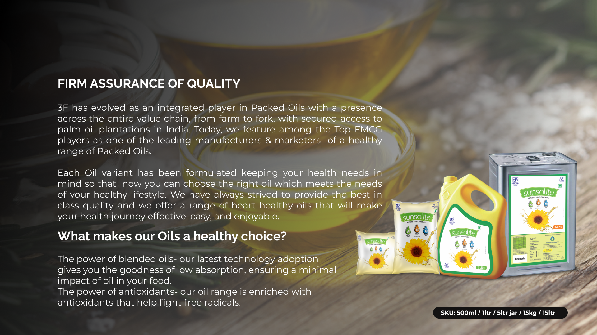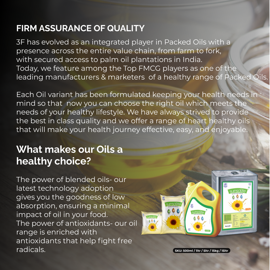 Suited for a wide variety of applications, our oils—manufactured by 3F Industries, leading edible oil manufacturers in Hyderabad, India—offer excellent oxidative stability and specific melting behavior. This ensures superior consumption properties for various needs, including pure sunflower oil, deep frying oil, commercial edible oil for industrial use, and pooja oil. Experience the quality of our industrial edible oils and vanaspati products for all your culinary and industrial applications.